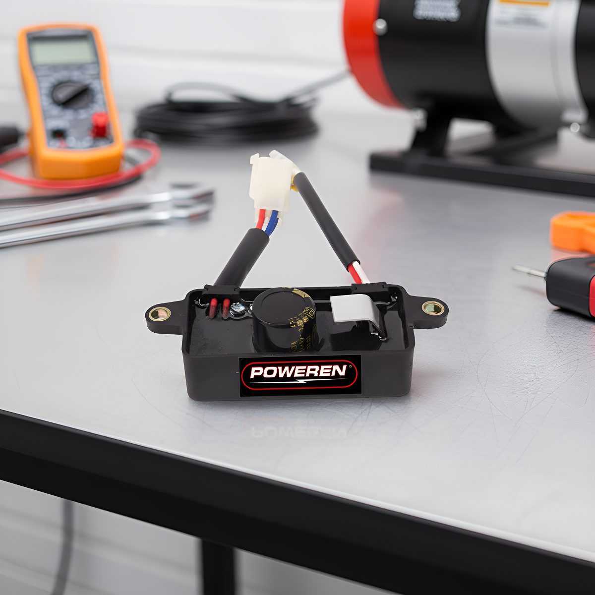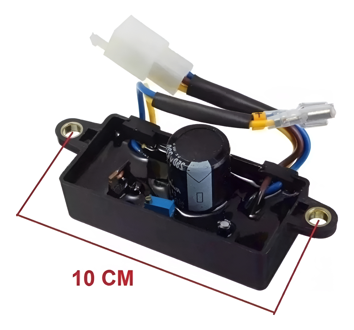 TAMAÑO DE INSTALACIÓN: 10 CM (DISTANCIA DE TORNILLO A TORNILLO) ADECUADO PARA GENERADORES DE 2500W – 3000W Y 6500W, GASOLINA O DIESEL. CAPACITOR: 220 mf 250V RECTIFICADOR DE ONDA COMPLETA TENSIÓN DE SALIDA ESTABLE CON RETROALIMENTACIÓN DE VOLTAJE NEGATIVO SOBRE VOLTAJE, SOBRE CORRIENTE Y PROTECCIÓN CONTRA CORTOCIRCUITOS 6 HILOS = 1 BLANCO PLUG (4 CABLES) + 1 AZUL + 1 AMARILLO SALIDA: 220V±5V DC < 2.5A (POSITIVO, NEGATIVO, DIRECTO A CARBONES) VOLTAJE DE EXCITACIÓN: 90 V ~ 120 V MUESTREO TENSIÓN (TENSIÓN DE REALIMENTACIÓN): AC 18 V FRECUENCIA: 50/60Hz. AUTOMÁTICO DE AJUSTE DE TENSIÓN DE PRECISIÓN: = ± 5% _______