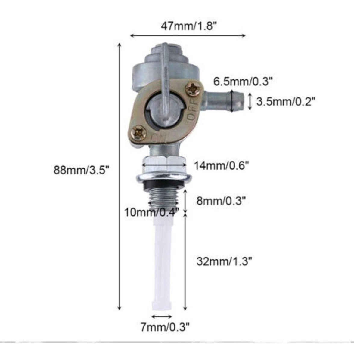 Compatible para diferentes marcas como Hyundai – Truper – Poweren – Pretul – Mikels – Mpower – Etc. Incluye malla filtrante para no permitir el pasó de residuos contaminantes hacia el carburador y ofrecerle una mayor vida útil de trabajo a su equipo Es Ampliamente Recomendada Para Generadores (plantas de luz) 600watts – 800watts – 1000watts – 1200watts con motor de 2 tiempos Llave de Combustible (metálica) Medida de entrada: 10-mm (macho) Roscable Medida de tuerca: 14-mm Medida de salida: 6.5-mm para manguera Medida de longitud: 80-mm Salida de combustible: lado derecho.