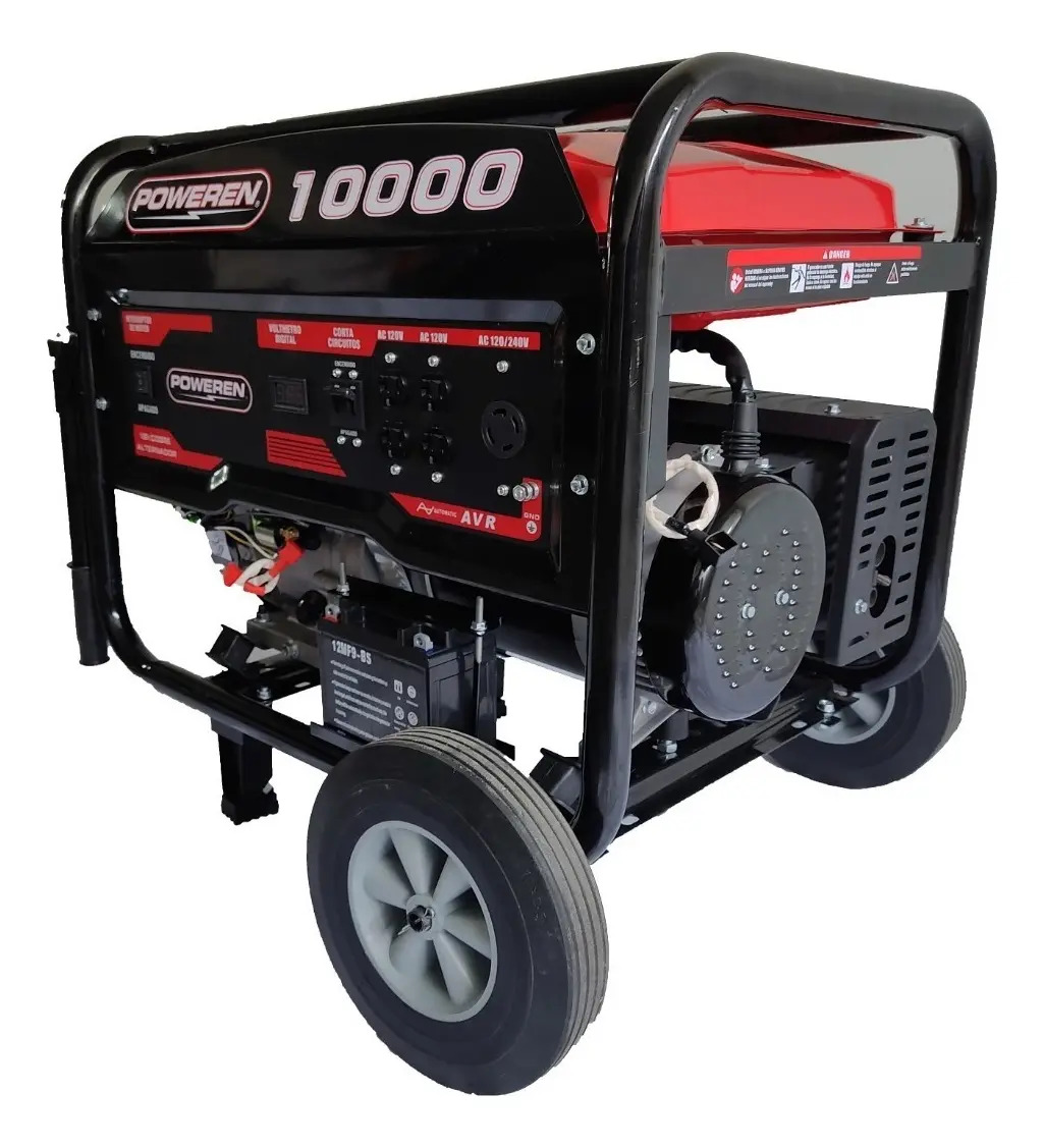 Marca: POWEREN Arranque: Por botón o retráctil(manual), Capacidad máxima 10000 WATTS Capacidad nominal 8000 WATTS Voltaje 120/240 VOLTS Amperaje 60 AMP. Motor 16HP/3600 R/MIN Nivel de ruido 60DB @7 METROS Tanque 25 LITROS Funcionamiento al 50% de carga 13 HORAS Peso 105 KILOS Capacidad de aceite: 1 lt con sensor de aceite Toma de corriente: 120v-20ª (4) 120v- 240v 30ª (1)